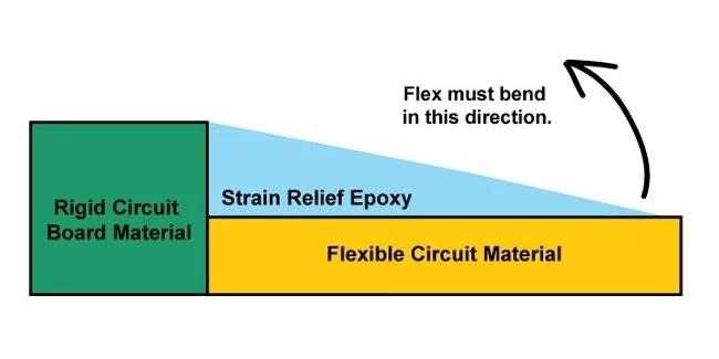 如果部件在界面處彎曲,剩余的固化樹脂可能會損壞下面的柔性層壓板。 為了保護(hù)下面的柔性層壓板, 柔性PCB設(shè)計(jì)師需要在彎曲過渡區(qū)域中的應(yīng)力消除環(huán)氧樹脂。 如下圖所示,施加的固化環(huán)氧樹脂將有助于延長經(jīng)過剩余固化樹脂的彎曲區(qū)域。