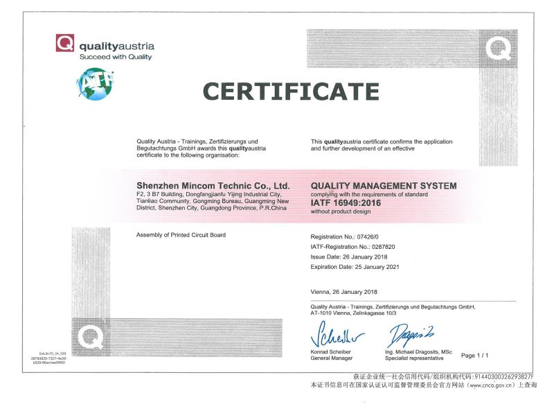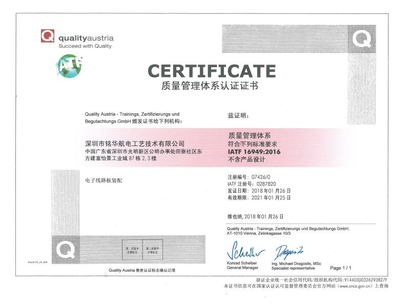 銘華航電取得電子線路板裝配 IATF16949:2016 質(zhì)量管理體系認(rèn)證證書的公告