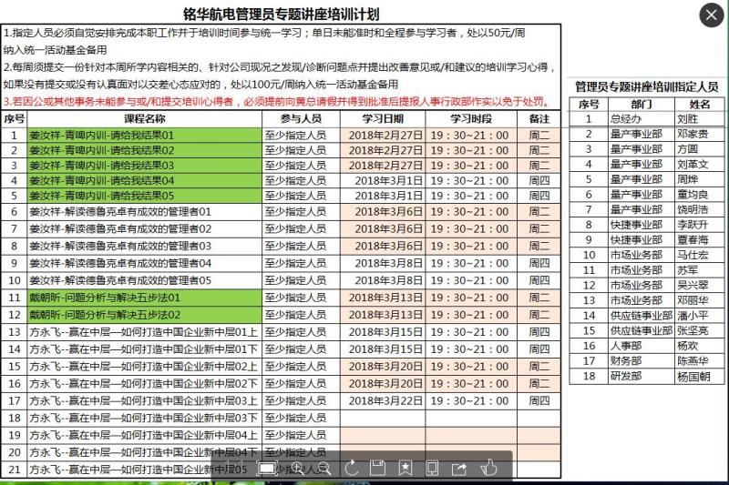 敏華航電2018年,為了建設(shè)高效和富有戰(zhàn)斗力的團(tuán)隊(duì)制定了專題講座培訓(xùn)計(jì)劃,銘華航電的市場部,量產(chǎn)事業(yè)部,快捷部,供應(yīng)鏈?zhǔn)聵I(yè)部,研發(fā)部,人事部們,每周二,周四晚上19:30-21:00 進(jìn)行視頻培訓(xùn);